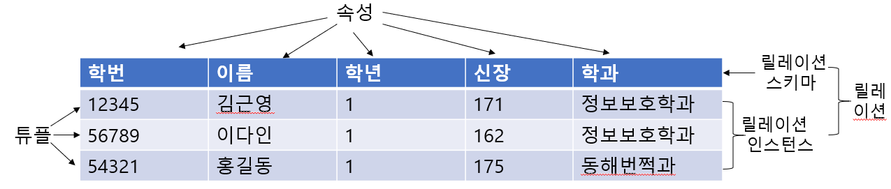 ● 데이터들을 표(Table)의 형태로 표현한 것으로 구조를 나타내는 릴레이션 스키마와 실제 값들인 릴레이션 인스턴스로 구성
